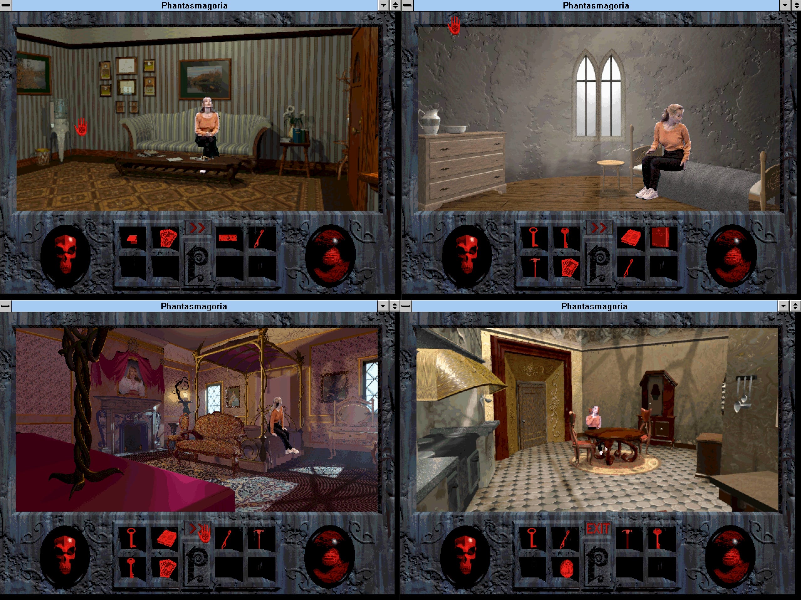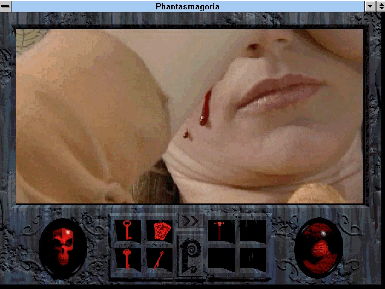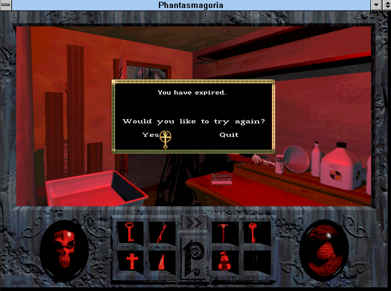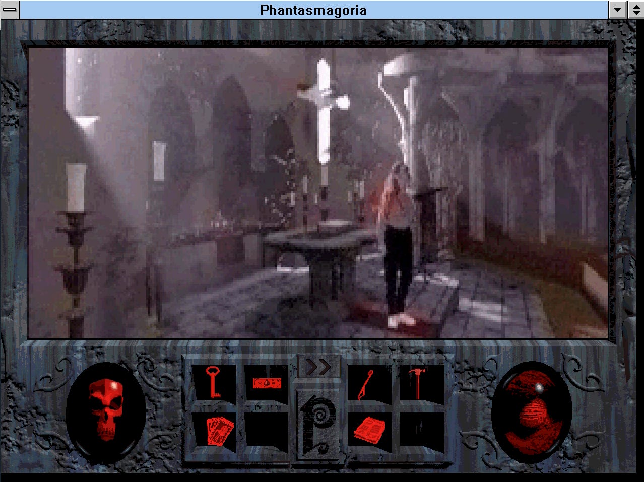 Phantasmagoria es un juego particular, porque no se parece tanto a la idea que tenemos de FMV. Así como Roberta hizo las Aventuras de Texto con Gráficos, esto es una suerte de Aventura Gráfica con Video. El juego es un point and click al mejor estilo Monkey Island. Tenemos que desplazar a nuestro sprite de video por los diferentes ambientes16 Recolectar objetos para resolver diferentes puzzles para hacer avanzar la historia. Esos son los dos pilares del juego y uno se sostiene y el otro no. A diferencia de la mayor parte de los juego de SierraOnLine este es bastante facilongo1718 Me atrevería a decir que el juego no tiene(?) jugabilidad. Por mas increíble que parezca es muy entretenido y te dan ganas de volver a él día tras día hasta llegar al final, porque es muy entretenido desmarañar la historia, ver que sucede a continuación y especialmente encontrar el camino en ese mapa rarísimo. Diría que la mejor manera de jugarlo es no sabiendo jugar, perderse es importantísimo para poder llegar a ver la mayor cantidad de escenas. Perderse es frustrarte al comienzo pero después influye en la inmersión y debido al escenario dinámico, que es mucho mas que la habilidad de Adrianne de sentarse en todos lados, que hace que los objetos y locaciones cambien en cada episodio, ayuda a que vuelvas a revisar lugares que tal vez no visitarías si simplemente jugaras linealmente para resolver el puzzle principal. Algo que tiene Phantasmagoria que se extraña mucho es el TEMPO, la tendencia hace años es todo rápido, aquí la cosa es mas pausada, mas reflexiva y se agradece.