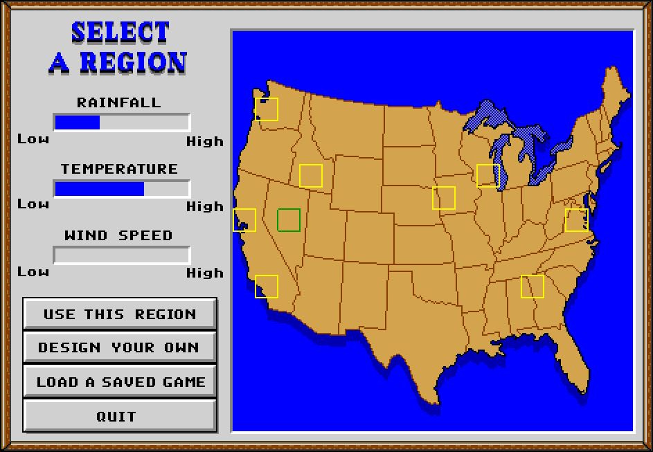 El juego se presenta ante nosotros con una musiquita rockabilly y un mapa de Estados Unidos de Norte América con rectángulos rojos que nos indican diferentes granjas a lo largo y ancho de los cincuenta y pico8 Estados del país del norte. Como imaginaran no tengo la mas mínima idea de las zonas geográficas de ese país9. a pesar que el juego indica con unos pocos gráficos que tal son las condiciones de suelo y climáticas de cada zona.