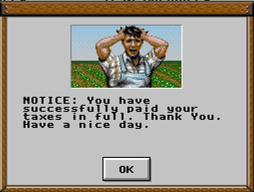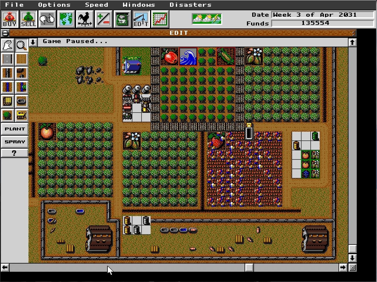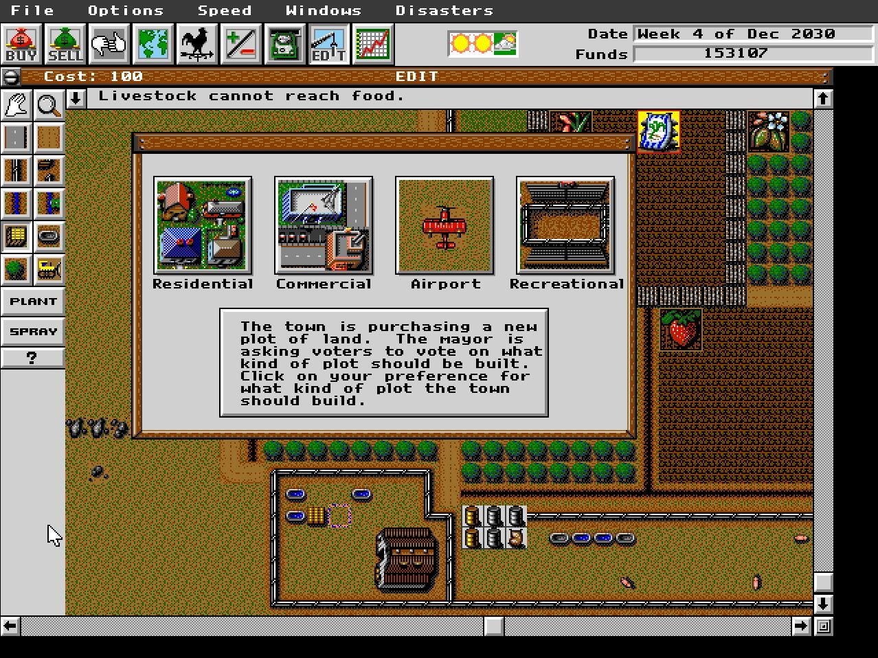 Conseguir el SimFarm no fue una tarea muy dura, e instalarlo tampoco5. Este simulador de granja6 es un spin off directo de SimCity, pero no del 2000, del SimCity original, ese con el que los mas jóvenes entre los viejos no estamos tan familiarizados. El original tiene una vista cenital7, es bastante menos intuitivo y alguna vez lo hemos probado cinco minutos para sacarlo y volver al isométrico SimCity2000. Pero… ¿Qué tan difícil puede ser?