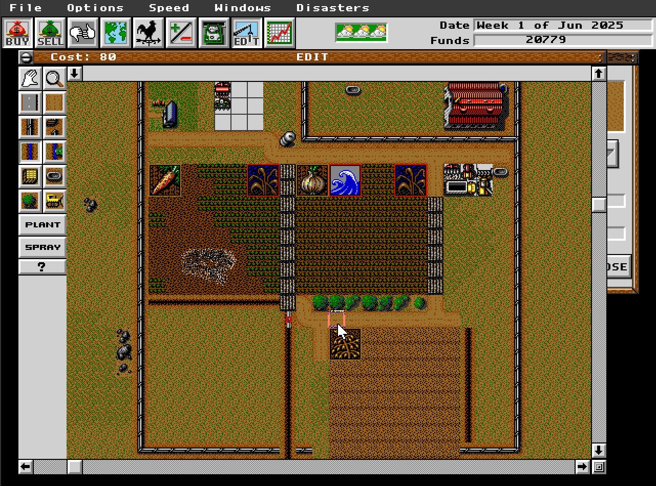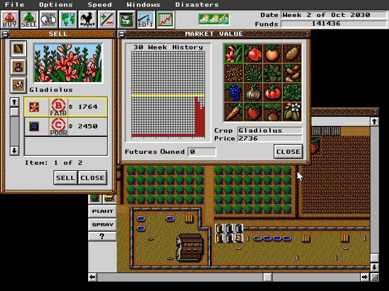 Esto me llevó una interfaz con varias ventanas flotantes al mejor estilo Windows 3.11011. Una de ellas tenía varias ventanas varios íconos y la otra, mi flamante granja vista de arriba. Hasta ahí todo bien, pero ¿Qu{e tenía que hacer?