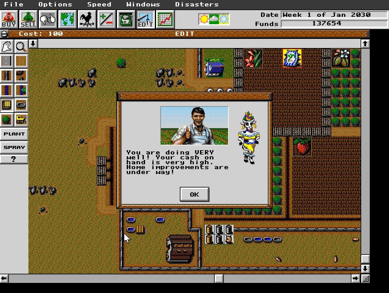 Ya después de un par de partidas aprendí a desprenderme un poco del paso a paso del Manual, y hasta me atreví a gastar un poco menos en el inicio para que me quede algo más de resto17. Pero tal vez lo más importante estaba en la parte del manual que elegí no leer, una muestra detallada de cada una de las cosas que se podían plantar, qué condiciones necesitaban para crecer bien y en qué época del año plantarlas. Eso era clave para que nuestras cosechas sean buenas y obtener el mayor provecho de ella ellas. Obviamente yo no me iba a leer todo eso en el manual, además no sé nada sobre cultivos18 así que con un poco de prueba y error logre comprender cuáles eran algunos de los cultivos más convenientes y así me empezó a ir un poco mejor. Pero no sólo eso fue lo que descubrí, también descubrí que una de las mayores razones por las que no habia logrado hacer nada de dinero19 era que no me estoqueaba de los distintos fertilizantes y semillas, sino que cada vez que los necesitaba simplemente clickeaba el botón para solucionarlo. El tema es que así te cobran también tipo un envío y mano de obra, digamos que te ahorras MUCHO si simplemente compras las semillas y los fertilizan antes, los guardas y despues los usas cuando los necesitas20. Cuando comprendí eso empecé a evolucionar en el juego y hasta pude mejorar mi rancho.